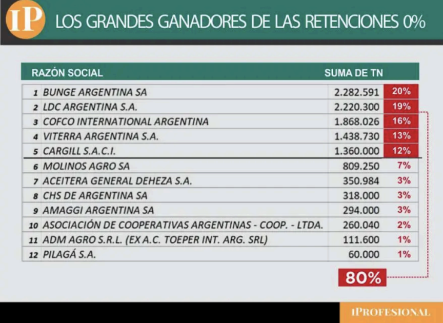 Aunque no se divulgó un listado oficial, trascendió que las principales beneficiarias fueron grandes multinacionales y firmas de peso en el comercio de granos y aceites