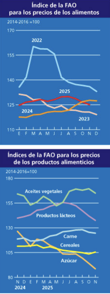 El índice de precios de los alimentos de la Organización de las Naciones Unidas para la Alimentación y la Agricultura (FAO) se situó en un promedio de 125,1 puntos en noviembre de 2025, con una disminución de 1,5 puntos (un 1,2 %) respecto del nivel revisado de octubre, de 126,6 puntos, lo que representa la tercera disminución mensual consecutiva. Los descensos en los índices de precios de los productos lácteos, la carne, el azúcar y los aceites vegetales compensaron el aumento del índice relativo a los cereales. En general, el índice de precios de los alimentos se ubicó 2,6 puntos (un 2,1 %) por debajo de su nivel de noviembre de 2024 y se mantuvo 35,2 puntos (un 21,9 %) por debajo del máximo alcanzado en marzo de 2022.